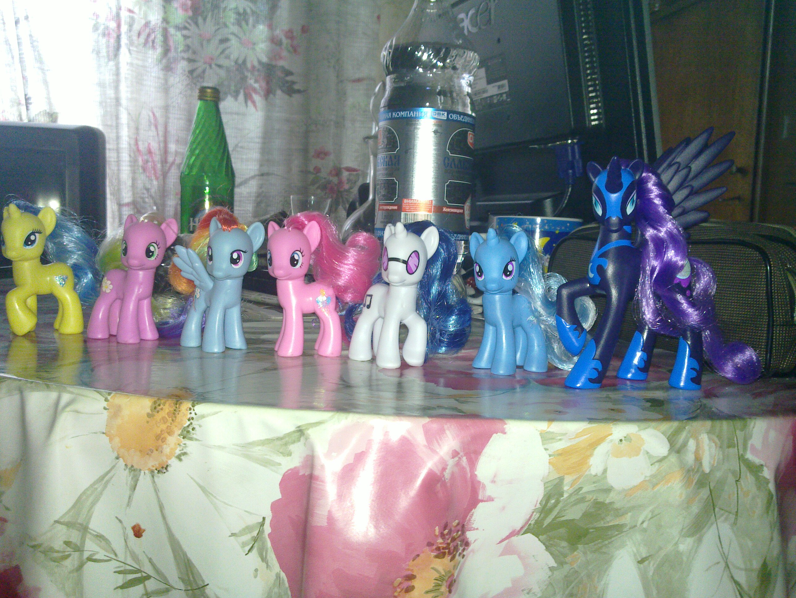 Unwrapped Nightmare Moon collection. From right to left: Nightmare Moon, Trixie Lulamoon, DJ Pon-3 (Vinyl Scratch), Pinkie Pie, Rainbow Dash, Flower Wishes (Daisy), Lemony Gem.